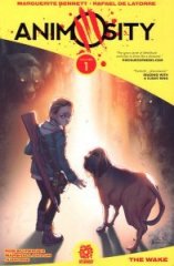 O Adam είναι κτηνίατρος στο Σαν Φρανσίσκο και έχει φωνάξει τον εξολοθρευτή τρωκτικών, επειδή υπάρχει μια τεράστια τρύπα μέσα στην κλινική. Ενώ μιλάει μαζί του, διαπιστώνει έντρομος ότι οι αρουραίοι έχουν επιτεθεί στον εξολοθρευτή, αλλά και ότι ... μιλάνε και φαίνονται να έχουν αποκτήσει συνείδηση... Και όντως αυτό συμβαίνει. Σε όλο τον κόσμο, ταυτόχρονα, όλα τα είδη ζώων, άγρια ή εξημερωμένα, φαίνονται να έχουν αποκτήσει όχι μόνο συνείδηση, αλλά και τη δυνατότητα ομιλίας, κάτι ακόμα πιο εντυπωσιακό εάν αναλογιστούμε ότι δεν έχουν φωνητικές χορδές κατάλληλες να παράγουν ήχους της ανθρώπινης γλώσσας. Αυτό το φαινόμενο ονομάστηκε "Wake" (ξύπνημα, αφύπνιση) και μας εισάγει στον κόσμο του Animosity (= ισχυρή εχθρότητα, υπόψιν ότι η λέξη παράγεται από το λατινικό anima [=ψυχή] και ως εκ τούτου είναι ομόρριζη της λέξης animal), ενός κόμικ που πρωτοκυκλοφόρησε το 2016 από τις εκδόσεις Aftershock, τις οποίες προσωπικά αγνοούσα. Αν και το κόμικ ξεκινά με τον Adam, αμέσως καταλαβαίνουμε ότι η κεντρική ηρωίδα είναι η προ-έφηβη Jesse (μαθαίνουμε πολύ νωρίς ότι είναι ετεροθαλής αδελφή του Adam) και ο σκύλος της, Sandor. Οι δυο τους θα αρχίσουν μια περιπλάνηση κατά μήκος των (πάλαι ποτέ, πλέον) ΗΠΑ, προκειμένου να φτάσουν στο Σαν Φρανσίσκο και να βρουν τον Adam. Στο ταξίδι τους αυτό θα συναντήσουν και ενίοτε θα αντιμετωπίσουν διάφορες κοινότητες ζώων, ανθρώπων, αλλά και μεικτές , οι οποίες προσπαθούν να επιβιώσουν σε έναν κόσμο που έχει καταρρεύσει, αλλά σε ορισμένες περιπτώσεις να συμβιώσουν αρμονικά. Παράλληλα, αναρωτιούνται τι προκάλεσε την Αφύπνιση και γνωρίζονται με κάποιους επιστήμονες, οι οποίοι διατείνονται ότι γνωρίζουν (και πιθανόν και πώς θα την αναστρέψουν; ). Αυτοί είναι οι δραματουργικοί άξονες γύρω από τους οποίους περιστρέφεται το καλογραμμένο σενάριο της Bennett, το οποίο δεν αποφεύγει κάποιες αφέλειες (Όλα τα ζώα μιλάνε αγγλικά; Δηλαδή στις άλλες χώρες, μιλάνε τις άλλες επίσημες γλώσσες των χωρών; Πού βρίσκονται τα έντομα, η μακράν πολυπληθέστερη μορφή ζωής στον πλανήτη; ), αλλά από την άλλη, κατορθώνει να αποφύγει τη σχηματοποίηση και τον εύκολο μανιχαϊσμό (δεν έχουν όλα τα ζώα εχθρικά αισθήματα απέναντι στους ανθρώπους, αλλά δεν έχουν απαραιτήτως και φιλικές σχέσεις μεταξύ τους, αντιθέτως, βλέπουμε και κάποια ζώα να εκμεταλλεύονται τους ανθρώπους ή άλλα είδη ζώων) και γενικά κατορθώνει να κρατήσει το ενδιαφέρον και να θέσει και κάποια κρίσιμα ερωτήματα σχετικά με τον άνθρωπο και τη σχέση του με τη φύση. Το σχέδιο του De Latorre δεν με ενθουσίασε, αν και οφείλω να ομολογήσω ότι απεικονίζει με μεγάλη μαεστρία τις εκφράσεις των ανθρώπων, μολονότι οι εκφράσεις των ζώων απεικονίζονται υπερβολικά ανθρωπομορφικές (κατανοητή επιλογή, αλλά δεν ξέρω εάν με βρίσκει σύμφωνο). Εν πάση περιπτώσει, δεν θέλω να αδικήσω ένα σχέδιο, που εξυπηρετεί απόλυτα το σκοπό του και ισορροπεί πολύ επιτυχημένα ανάμεσα στο ρεαλιστικό/ενήλικο και το φανταστικό/παιδικό και μας χαρίζει κάποιες όμορφες στιγμές. Συνοπτικά, δεν πρόκειται φυσικά για το καλύτερο κόμικ που έχω διαβάσει, αλλά θεωρώ βαίνει βελτιούμενο καθώς προχωρά και ότι είναι μια σειρά που αξίζει να διαβάσετε. Η σειρά συνεχίζεται στις ΗΠΑ και νομίζω έχει φτάσει έως το #12. Τα 8 πρώτα τεύχη, μαζί με ένα ειδικό τεύχος, συγκεντρώθηκαν σε 2 TPB (και, νομίζω, σε ένα Deluxe Hardcover). Εγώ τα διάβασα από τα 2 ΤPB, το πρώτο εκ των οποίων έχει εκτεταμένο Cover Gallery, ενώ το δεύτε