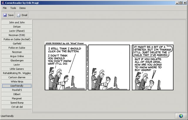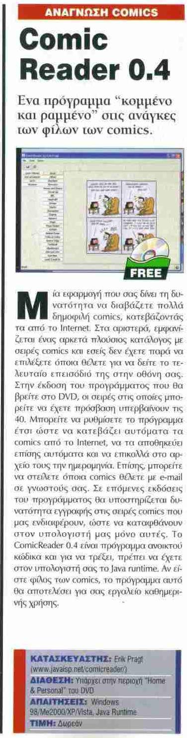 PAPCY02 Posted September 1, 2007 Member ID: 2,992 Group: Members Topic Count: 8 Content Count: 241 Reputation: 437 Achievement Points: 241 Days Won: 0 With Us For: 6,813 Days Status: Offline Last Seen: Wednesday at 03:10 PM Age: 43 Posted September 1, 2007 Ένα προγγραμα για να διαβάζετε ημερήσια cοmics από το ίντερνετ περιγραφή από την ιστοσελίδα του The ComicReader is a program to read daily comics like Garfield, Dilbert, Userfriendly and lots of other daily comics. The comicreader has unique features like autodownloading the comics, central managed comic definitions and the option to email comics. Screenshot: This is the main screen This is the options panel. περιγραφή από ένα περιοδικό ιστοσελίδα http://sourceforge.net/projects/comicreader δεν το έχω ακόμη δοκιμάσει άλλα ελπίζω να φανεί σε εσάς χρήσιμο 1 Quote
