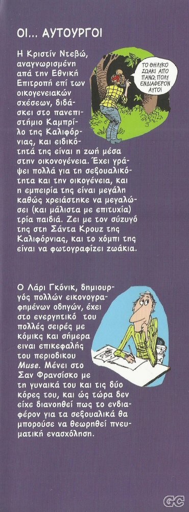 DJO Posted May 16, 2012 Member ID: 556 Group: Veterans Topic Count: 1,534 Content Count: 22,474 Reputation: 122,279 Achievement Points: 22,479 Days Won: 792 With Us For: 6,910 Days Status: Offline Last Seen: December 31, 2020 Posted May 16, 2012 Μετάφραση του The Cartoon Guide To Sex, που είχε πρωτοκυκλοφορήσει το 1999. Πρόκειται για ίσως τον καλύτερο κομιξοεικονογραφημένο οδηγό για τον έρωτα, την ερωτική συνεύρεση και τη συντήρηση μιας υγειούς σχέσης. Αναλυτικά τα κεφάλαια: 1-Τα Παράδοξα Του Σεξ 2-Όλοι Είμαστε Ζώα! Για Την Αναπαραγωγή Χρειάζεται Το Σεξ 3-Η Ανθρώπινη Σεξουαλική Ανατομία 4-Η Σεξουαλική Διαπαιδαγώγηση 5-Ποιανού Είναι Τα Κενά; Τα Δυο Φύλα Και Η Σεξουαλικότητα Στην Ενήλικη Ζωή 6-Η Επικοινωνία 7-Ο Έρωτας 8-"Το Κάνουμε"; 9-Για Ν'Αποφύγουμε Την Εγκυμοσύνη 10-Η Σεξουαλική Υγεία Και Οι Εναλλακτικές Επιλογές 11-Μη Συναινετικό Σεξ 12-Προβλήματα Και Λύσεις Ένα ενδεικτικό δισέλιδο: Γενικά, είναι απίστευτα καλογραμμένο και τα αντιμετωπίζει όλα σφαιρικά, αντικειμενικά και με βάσεις. Εξού και έχει μέχρι και μύθους και αλήθειες για το Aids. Και μέσα σε όλα, έχει κάτι ατάκες οι οποίες σε κάνουν να κυλιέσαι στα πατώματα απ'τα γέλια, για να ξεφύγει το μυαλό από τον όγκο των πληροφοριών. Το αντιδιαμετρικά αντίθετο δηλαδή από τη σειρά βιβλίων των Νέων όπου μπούκωνες από τις πρώτες σελίδες. πχ: ~ Ο πολιτισμός είναι καταδικασμένος αν δεν κρύψουμε το πιπί μας - Γιαγιά υπάρχει κοινή συναινέσει Νεκροφιλία; - Να διαβάσεις τη διαθήκη μου! (τύπος κοιτάζει ημίγυμνο μοντέλο) Αα! Δείχνεις πολύ καλός άνθρωπος! ^ Σύνδρομο του Φωτοστέφανου ^ Σε αυτό το έργο - ειλικρινή μελέτη χωρίς ταμπού (τα κατακεραυνώνει) οδηγοί μας είναι η Μητέρα Φύση και το γκέι Ξωτικό επί της εθιμοτυπίας και ναι, προτείνεται ανεπιφύλακτα. Θα μάθετε 1000 φορές περισσότερα και σωστότερα πράματα από ότι η Βιολογία Γυμνασίου. Αλλά και εκτός αυτού, 9.90€ είναι πραγματικό value for money για την καλύτερη & πιο τίμια κομιξοεικονογραφημένη μελέτη που έγινε ποτέ για το σεξ. Μιλάμε για 244 σελίδες... Είχε κυκλοφορήσει και παλιότερα, από τις εκδόσεις Περίπλους. Καθαρό 10' από εμέ. Must have. 13 Quote
