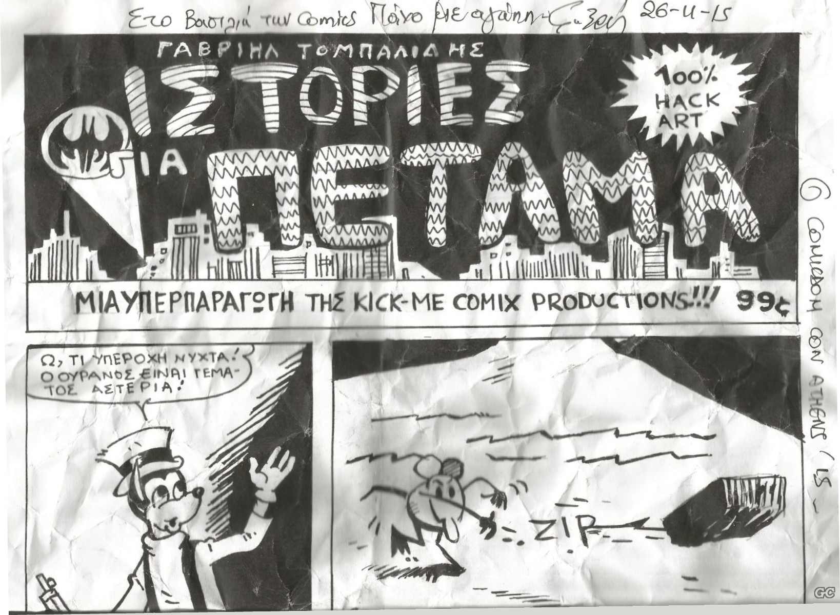 Βασιλεύς των κόμικς Posted May 5, 2015 Member ID: 10,466 Group: Honored Topic Count: 265 Content Count: 3,512 Reputation: 36,814 Achievement Points: 3,528 Days Won: 88 With Us For: 6,103 Days Status: Offline Last Seen: November 5, 2021 Posted May 5, 2015 Ονομαστική τιμή:1€ Οι Ιστορίες για πέταμα είναι ακριβώς αυτό που λένε,για πέταμα στα σκουπίδια.Ο Τόμπυ το έκανε το θαύμα του και πάλι.Αλλά ας πάρουμε τα πράγματα απο την αρχη: comicon of Athens 2015,περίπτερο της comicworld,στην γωνιά κάθεται ο Γαβριήλ έχοντας μπροστά ένα καλάθι των αχρήστων που μέσα του υπάρχουν τσαλακωμένα χαρτιά σε σχήμα μπάλας.Πάρτε ένα ,έλεγε,και ρίχτε ένα ευρώ με δύναμη εδώ,δείχνωντας ένα τενεκεδένιο κουτάκι.Όταν ξετσαλάκωνες το χαρτί βρισκόσουνα μπροστά σε τεραστίου μέγεθος χαρτιού με κόμιξ 2 σελίδων όπου ο Σπάΐντερ-μαν,ο Μπλεκ, ο Σεραφίνο,ο Αστεριξ,Ο Φαντομ αλλά και ο συνονοματός του Ντακ,Ο Χουλκ-ναι Χουλκ, και όχι Χαλκ,πως φαίνονται οι παλιοι αναγνώστες του Καμπανά-αλλά και άλλοι ήρωες μπερδεύονται σε μία ιστορία που είναι για ...πέταμα. Ο Γαβριήλ μου είπε ότι πρόκειται για δήλωση,για τοποθέτηση και όχι για ξεπέτα.Αγνωσται οι βουλαί του καλλιτεχνη.Τι εννοεί για πέταμα ;οι ήρωες που μεγαλώσαμε εμεις οι 50άρηδες είναι πια παρελθον;για πεταμα δηλαδή;τα Πόκεμον,ο Γιουγκι-ο,οι Γκορμίτι,ο Μπεν-10 κάνανε ήρωες που μεγαλώσανε γενιές και γενιές πέρα,τους ρίξανε στους κάδους των σκουπιδιών;Ή μήπως εννοεί ότι τα χρόνια περάσαν εμείς οι αναγνώστες μεγαλώσαμε πενηνταρίσαμε(και βάλε) ξεχάσαμε με τι γεμίζαμε τις βαλίτσες των παιδικών μας αναμνησεων και μαζι με αυτες και οι χαρτινοι ήρωες Κάπτεν Μαρκ,Ακιμ,Ντικ Τρέηση,Πατ Παλούκα,Ομπραξ και τόσοι άλλοι.Μεγαλώσαμε,ξεχάσαμε. Εγω περιμένω την στιγμή που ο κάτοχος του βραβείου για το KAPΟW θα κάνει το έργο που του αξίζει γιατί ξέρω ότι το έχει αλλά δε του έχει βγεί ακόμα. Ειμαι o comicsking για το greekcomics 31 Quote