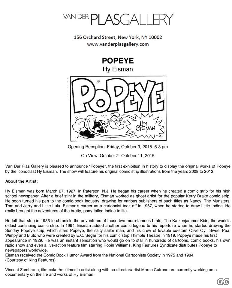 aprositos Posted October 7, 2015 Member ID: 27,926 Group: Members Topic Count: 34 Content Count: 323 Reputation: 3,131 Achievement Points: 323 Days Won: 1 With Us For: 4,680 Days Status: Offline Last Seen: Yesterday at 07:07 AM Age: 60 Posted October 7, 2015 (edited) H πρώτη έκθεση στην ιστορία με πρωτότυπα έργα του Ποπάυαπό τον θρύλο Hy Eisman. Η έκθεση θα περιλαμβάνει πρωτότυπες κόμικ εικονογραφήσεις στριπ από τα έτη 2008 έως 2012.Ο πολυβραβευμένος Hy Eisman γεννήθηκε στις 27 του Μαρτίου του 1927, στο Paterson, NJ. Ξεκίνησε την καριέρα του όταν δημιούργησε ένα κόμικ για τηνσχολική του εφημερίδα. Μετά από ένα σύντομο πέρασμα από το στρατό, ο Eisman εργάστηκε ως καλλιτέχνης φάντασμα για το δημοφιλές τότε Kerry Drake κόμικ.Σύντομα η πένα του βρέθηκε στη βιομηχανία κόμικς, και σχεδίασε για διάφορους εκδότες και τίτλους όπως Nancy, The Munsters, Τομ και Τζέρι και τη Little Lulu.Η καριέρα του ως σκιτσογράφος απογειώθηκε το 1967, όταν άρχισε να σχεδιάζει το Little Iodine. Αυτός ήταν που πραγματικά έδωσε νέα πνοή στις περιπέτειες της.Το 1986 άρχισε να σκιτσάρει τα Katzenjammer Kids, το αρχαιότερο στον κόσμο συνεχές κόμικ.Το 1994, ο Eisman αναλαμβάνει το κυριακάτικο στριπ του Popeye ........τα υπόλοιπα στην έκθεση που γίνεται στην Van Der Plas Gallery από τις 02 Οκτωβρίου έως την 31η Οκτωβρίου 2015. Edited October 7, 2015 by aprositos 10 Quote