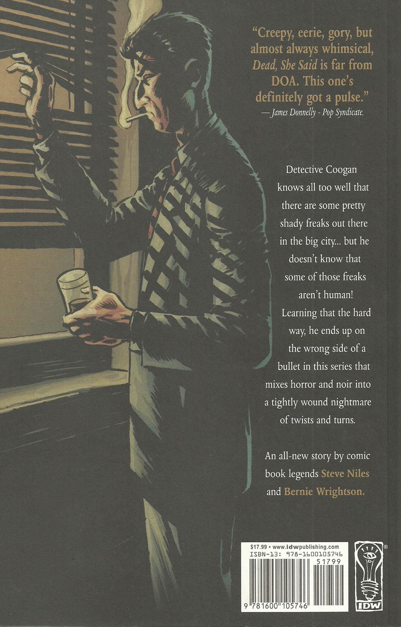 Ion Posted March 31, 2016 Member ID: 2,285 Group: Veterans Topic Count: 950 Content Count: 4,412 Reputation: 36,366 Achievement Points: 4,466 Days Won: 27 With Us For: 6,752 Days Status: Offline Last Seen: 6 hours ago Age: 42 Posted March 31, 2016 DEAD, SHE SAID Μία πολύ όμορφη συνεργασία δύο μαέστρων στο χώρο του υπερφυσικού κόμικ, του σεναριογράφου Steve Niles (Criminal Macabre) και του σχεδιαστή Bernie Wrightson (Creepy). Oι δυο τους έχουν συνεργαστεί και σε αρκετές ακόμα ιστορίες, όπως τα City of Others, The Ghoul και Doc Macabre, οπότε ξέρουμε τι να περιμένουμε! To Dead, She Said κυκλοφόρησε τον Δεκέμβριο του 2009 από την IDW σε paperback, και έχει 108 σελίδες (μαζί με τα εξώφυλλα). H συγκεκριμένη ιστορία έχει συμπεριληφθεί επίσης και στην έκδοση "The Monstrous Collection of Steve Niles & Bernie Wrightson" της IDW. Πρωταγωνιστής μας είναι ο Ντετέκτιβ Coogan, ένας αρκετά σκληροτράχηλος και ίσως λίγο βρώμικος μπάτσος, που μια μέρα ξυπνάει στο κρεβάτι του και διαπιστώνει ότι τον έχει τρυπήσει μια σφαίρα στην κοιλιά. Το κρεβάτι του είναι γεμάτο αίματα, τα σωθικά του κρέμονται, και αναρωτιέται γιατί δεν είναι νεκρός... σύντομα όμως καταλαβαίνει τί συνέβη: είναι νεκρός! Απλά για κάποιο ανεξήγητο λόγο, εξακολουθεί να κινείται κανονικά, κάτι που του δίνει την ευκαιρία να μάθει ποιος τον πυροβόλησε στον ύπνο του και για ποιο λόγο. Εσωτερική σελίδα Η βασική αυτή ιστορία είναι έγχρωμη, και εκτυλίσσεται σε 66 σελίδες. Και λέω η βασική, γιατί η έκδοση περιέχει και μια ιστορία bonus με τον τίτλο "Ain't She Sweet?", ασπρόμαυρη, 7 σελίδων, που αρχικά είχε δημοσιευθεί το 1972 στο Badtime Stories. Τις υπόλοιπες σελίδες του τεύχους καλύπτουν, αρχικά μια Art Gallery με τα έξτρα εξώφυλλα της κύριας ιστορίας αλλά και παλιά σκίτσα του Wrightson, και κατά δεύτερον το πλήρες "The Monsters: Color the Creature Book", μια έκδοση του 1974 με ασπρόμαυρα pin-ups τρόμου του σχεδιαστή. Pin-up από το The Monsters: Color the Creature Book Η ιστορία κινείται μεταξύ noir και μεταφυσικού, που είναι ένας από τους αγαπημένους μου συνδυασμούς στα κόμικς. Παρόλα αυτά, το σενάριο δεν είναι κάτι το τρομερό, αν και οι απότομες σαρκαστικές ατάκες του Niles κάνουν και εδώ αισθητή την παρουσία τους. Απ' την άλλη, το σχέδιο του Wrightson είναι εξαιρετικό! Γενικά έχει πλάκα, μπόλικη βία και αίμα (ξεκοιλιασμένα πτώματα κλπ), και προσωπικά το ευχαριστήθηκα αρκετά! Πηγές: comicvine comixology 14 Quote