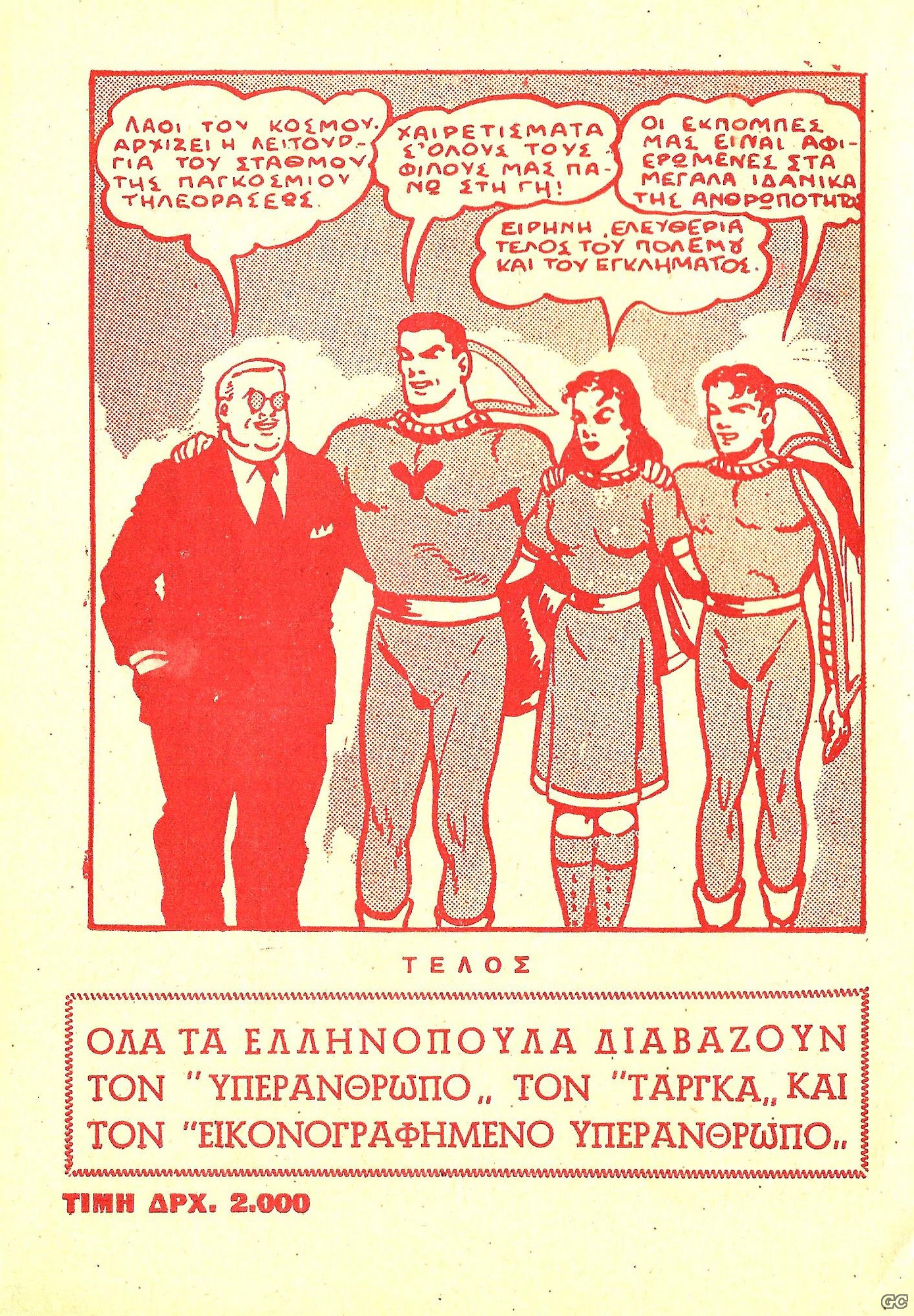 KILLMATH Posted November 11, 2016 Member ID: 2,097 Group: Veterans Topic Count: 33 Content Count: 961 Reputation: 13,994 Achievement Points: 1,006 Days Won: 2 With Us For: 6,803 Days Status: Offline Last Seen: 9 hours ago Age: 45 Posted November 11, 2016 Το 1952, και αφού η επιτυχία του «ΥΠΕΡΑΝΘΡΩΠΟΥ» ήταν τεράστια, είχαν κυκλοφορήσει παράλληλα και 2 τεύχη σε μικρό τιραζ με εικονογραφημένες περιπέτειες των ηρώων της σειράς με τίτλο «Ο ΕΙΚΟΝΟΓΡΑΦΗΜΕΝΟΣ ΥΠΕΡΑΝΘΡΩΠΟΣ». Το σενάριο ήταν του Στέλιου Ανεμοδούρα, ενώ η εξαιρετική εικονογράφηση ήταν του Βύρωνα Απτόσογλου . Τα δυο αυτά τεύχη ίσως να είναι και τα πρώτα ελληνικά εικονογραφημένα με θέμα την επιστημονική φαντασία. Το πρώτο τεύχος περιείχε την εικονογραφημένη περιπέτεια του Υπερανθρωπου «ΤΟ ΟΠΛΟ ΤΟΥ ΤΡΟΜΟΥ» και την ιστορία σε κείμενο με τίτλο «Ο ΚΟΝΤΟΣΤΟΥΠΗΣ ΙΔΙΩΤΙΚΟΣ ΝΤΕΤΕΚΤΙΒ». Το δεύτερο τεύχος ήταν εξ ‘ολοκλήρου εικονογραφημένο και περιείχε την ιστορία «Ο ΥΠΕΡΜΑΧΟΣ ΤΟΥ ΔΙΚΑΙΟΥ». Τέλος αξίζει να σημειωθεί ότι τα τεύχη αυτά συμπλήρωναν και τον 3ο τόμο της σειράς «ΤΑΡΓΚΑ» του ιδίου εκδότη. Ακολουθούν μερικές εσωτερικές του σελίδες του τευχους 2 ως δείγμα της εικονογράφησης Σκαναρισμένο και διαθέσιμο για ανάγνωση ΕΔΩ. Οι πληροφορίες αντλήθηκαν από τα βιβλία: ΕΛΛΗΝΙΚΗ ΠΑΡΑΛΟΓΟΤΕΧΝΙΑ ΚΟΜΙΚΣ – Κ.ΚΑΣΣΗΣ ΤΟ ΠΑΙΔΙΚΟ ΛΑΪΚΟ ΦΥΛΛΑΔΙΟ-ΠΕΡΙΟΔΙΚΟ- ΒΙΒΛΙΟ - Δ.ΧΑΝΟΥ ΗΡΩΕΣ ΤΟΥ ΣΤΕΛΙΟΥ ΑΝΕΜΟΔΟΥΡΑ – Γ.ΠΑΠΑΔΑΚΗΣ/Γ.ΒΛΑΧΟΣ/Ν.ΝΙΚΟΛΑΪΔΗΣ 27 Quote