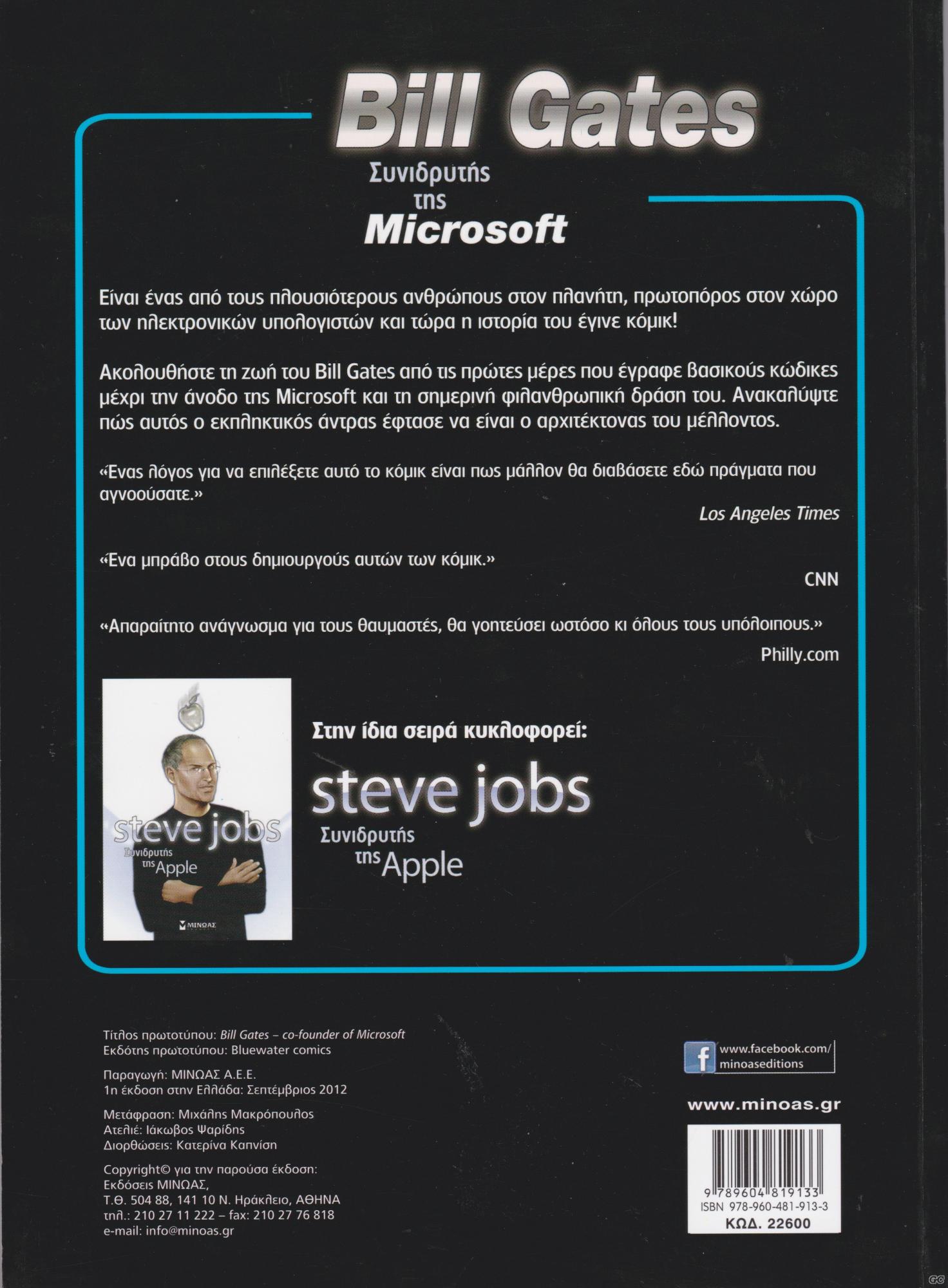 tik Posted December 8, 2016 Member ID: 25,133 Group: Veterans Topic Count: 281 Content Count: 6,527 Reputation: 64,617 Achievement Points: 6,595 Days Won: 47 With Us For: 4,944 Days Status: Offline Last Seen: 11 hours ago Age: 49 Posted December 8, 2016 (edited) Είναι ένα απλό, βιογραφικό κομικσάκι για τον Μπιλ Γκέιτς. Αυτό και τίποτα άλλο. Αντίστοιχο βιβλίο για τον Στιβ Τζομπς, έχει επίσης κυκλοφορήσει από τις εκδόσεις Μίνωας. Edited August 17, 2017 by tik Προστέθηκε παραπομπή για το βιβλίο του Στιβ Τζόμπς 17 Quote