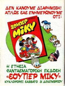 dionik Posted September 13, 2007 Member ID: 2,393 Group: Veterans Topic Count: 594 Content Count: 6,421 Reputation: 31,028 Achievement Points: 6,434 Days Won: 13 With Us For: 6,811 Days Status: Offline Last Seen: Thursday at 07:57 PM Age: 44 Posted September 13, 2007 Σούπερ Μίκυ Το Σούπερ Μίκυ εκδόθηκε για πρώτη φορά τον Ιανουάριο του 1978 σε διαστάσεις (σύμφωνα με τον Κάσση) 17,5 x 21,5, ως ειδική χριστουγεννιάτικη έκδοση του μηνιαίου περιοδικού "Μεγάλο Μίκυ". Μέχρι το 1984 (τεύχος 7) έβγαινε μόνο κάθε Χριστούγεννα, ενώ από το 1985 ξεκίνησε να βγαίνει και κάθε καλοκαίρι. Τον Ιανουάριο 1992 (τεύχος 22) είναι η τελευταία φορά που βγήκε ως ξεχωριστή έκδοση τερματίζοντας μια πορεία 14 ετών. Από τότε συμπτύχθηκε με τη σειρά Μεγάλο Μίκυ βγαίνοντας πάλι αρχικά κάθε Χριστούγεννα και καλοκαίρι, ενώ από τον Απρίλιο 1996 (τεύχος 344) άρχισε να βγαίνει αντί για καλοκαίρι, κάθε Πάσχα (Απρίλιο ή Μάιο). Οι σελίδες κατά την όλη διάρκεια της σειράς έχουν κυμανθεί μεταξύ 130 και 146. Πηγές www.wolfstad.com Ελληνική Παραλογοτεχνία και Κόμικς του Κυριάκου Δ. Κάσση (εκδ. 1998) Ευχαριστούμε για τα εξώφυλλα τους crc, germanicus19, Valtasar, jval, Ion13, photo, archon & albert. 27 Quote