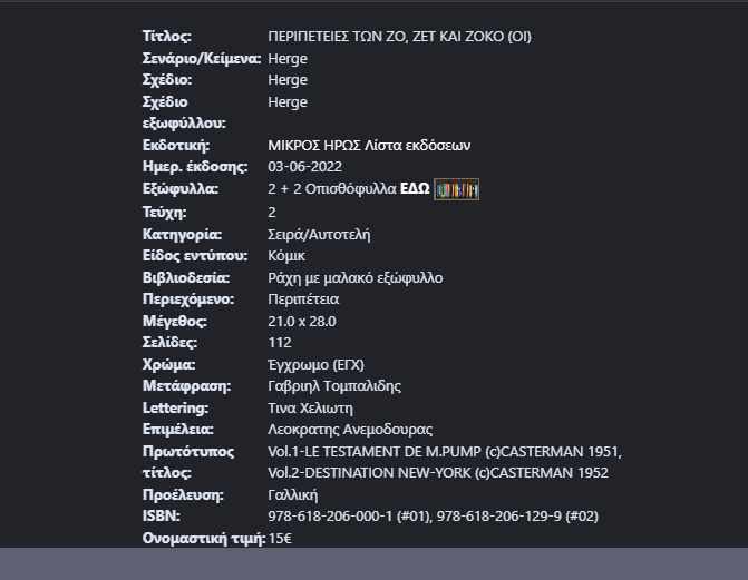 hudson Posted January 11, 2023 Member ID: 32,406 Group: Members Topic Count: 100 Content Count: 3,633 Reputation: 36,272 Achievement Points: 3,680 Days Won: 141 With Us For: 3,035 Days Status: Offline Last Seen: 6 hours ago Age: 45 Posted January 11, 2023 Τόμος 2 με τίτλο Η Μυστηριώδης Ακτίνα Μεταφέρθηκαν στην βάση. Ο τόμος περιλαμβάνει τα τεύχη #3 Καμιά Απάντηση από το Μανιτόμπα (vol.3: Le Manitoba ne repond plus 1952) #4 Η Έκρηξη του Καραμάκο (vol.4: L' erupion du Karamako 1952) Στοιχεία έκδοσης Ημερ. κυκλοφορίας: Ιανουάριος 2023 Σελίδες: 112 ISBN: 978-618-206-129-9 Ονομαστική τιμή: 15,00 ευρώ (στη σελίδα με τα στοιχεία έκδοσης έχει ένα λαθάκι, το vol.3 το έχει σαν vol.4 και το vol.4 σαν vol.3, δλδ γράφει vol.3 L' erupion du Karamako και vol.4 Le Manitoba ne repond plus) 13 5 Quote