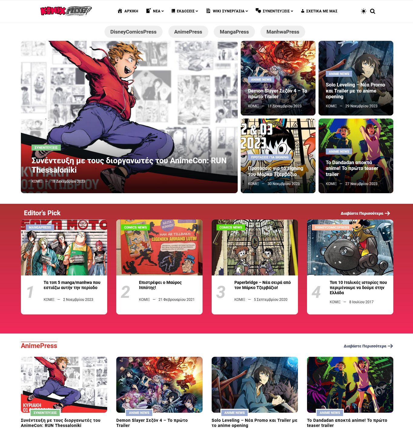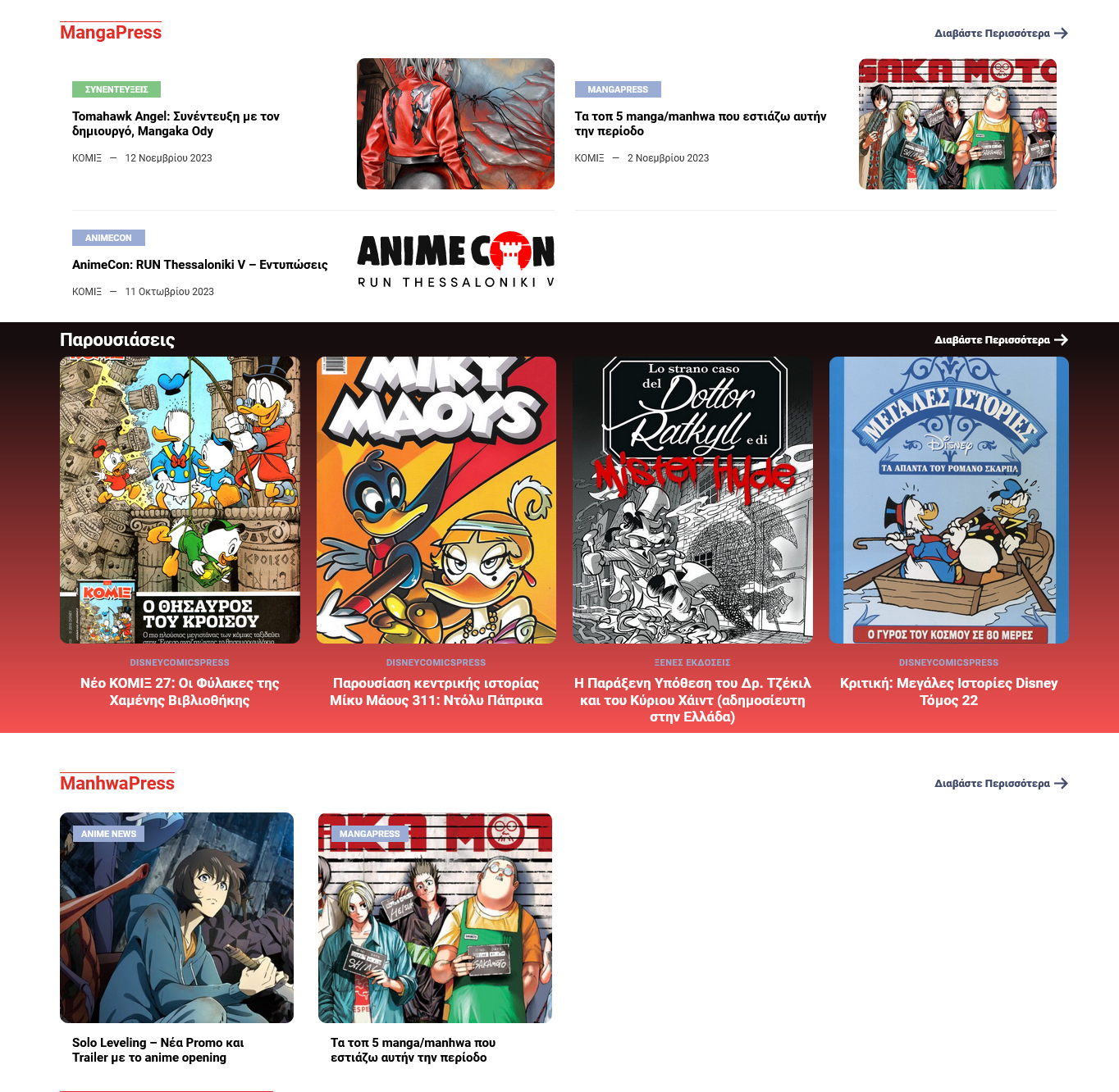 ΚΟΜΙΞ Posted November 5, 2023 Member ID: 25,682 Group: Members Topic Count: 146 Content Count: 4,267 Reputation: 27,422 Achievement Points: 4,313 Days Won: 11 With Us For: 4,833 Days Status: Offline Last Seen: 3 hours ago Posted November 5, 2023 Από το 2016, δημιουργήθηκε το KomixPress (πρώην DisneyComicsPress) ώστε να γράφονται άρθρα και νέα με μια προσωπική πινελιά αλλά και να γίνονται παρουσιάσεις – κριτικές γύρω από τις ελληνικές και ξένες εκδόσεις. Αρχικά εστιάζαμε μόνο στα Ντίσνεϋ κόμικς αλλά αυτό άλλαξε από το 2023. Για αυτό έφτιαξα και νέο θρεαντ που το διαχωρίζει με το αντίστοιχο Ντισνεϊκό Γιατί KomixPress; Θα μου πείτε γιατί το συγκεκριμένο και η αλλαγή; Το συγκεκριμένο όνομα δόθηκε διότι η λέξη Κομιξ (πέρα από το ομώνυμο περιοδικό) χρησιμοποιείται πολύ συχνά στη χώρα μας αντί για το κόμικς. Οπότε στην ουσία με το νέο τίτλο εννοούμε όλων των ειδών τα κόμικς. Επίσης, θέλαμε το νέο όνομα να θυμίζει κάπως το παλιό και οπότε έγινε ο παραπάνω συνδυασμός. Ένας άλλος λόγος που έγινε η αλλαγή αυτή είναι διότι θέλουμε να μιλάμε και για άλλα είδη κόμικς που μας αρέσουν και να μην περιοριζόμαστε μόνο στα Ντίσνεϋ στα οποία έχουμε μια αδυναμία. Συνεργασία με την ΚΟΜΙΞ Wiki Το KomixPress συνεργάζεται με την ΚΟΜΙΞ Wiki. Στη Wiki μπορείτε να βρείτε αναλυτικά άρθρα και πρότζεκτ σχετικά με τους χαρακτήρες, τις εκδόσεις, τους δημιουργούς που σχετίζονται με τον έναν ή τον άλλο τρόπο με το περιοδικό ΚΟΜΙΞ. Ενώ, το blog είναι πιο προσωπικό και στο τμήμα DisneyComicsPress υπάρχουν άρθρα σχετικά με τα Ντίνσεϋ κόμικς. Σκοπός του είναι να ενημερώσει για πρόσφατα νέα, να παρουσιάζει συνεντεύξεις που έχουν παρθεί από δημιουργούς, να γίνονται παρουσιάσεις/κριτικές για τα κόμικς της Ντίσνεϋ. Άρθρα πέρα από τα Ντίσνεϋ κόμικς Παρακάτω τα 2 πρώτα άρθρα που έχουν γραφτεί πέρα από τα Ντίσνεϋ κόμικς και θα ακολουθήσουν και άλλα: AnimeCon: RUN Thessaloniki V – Εντυπώσεις Τα τοπ 5 manga/manhwa που εστιάζω αυτήν την περίοδο 16 Quote