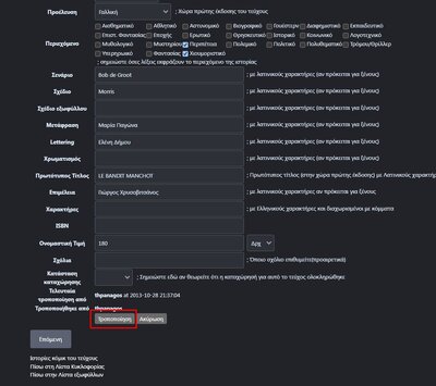 nikolas12 Posted July 23, 2024 Member ID: 33,354 Group: Moderator Topic Count: 831 Content Count: 5,422 Reputation: 46,174 Achievement Points: 2,310 Days Won: 291 With Us For: 2,708 Days Status: Offline Last Seen: 10 hours ago Age: 30 Posted July 23, 2024 Πριν από 1 ώρα, Indian είπε: Εντάξει, δεν το λες και λάθος (τουλάχιστον με την έννοια της παράβλεψης). Όταν ένα μέλος ανεβάζει ένα εξώφυλλο το οποίο δεν υπάρχει στην βάση και δεν υπάρχουν σαφείς αποδείξεις ότι πρόκειται για Β' έκδοση, τότε το βάζουμε σαν Α' έκδοση. Αν μετά κάποιος άλλος ανεβάσει ένα τεύχος που φέρει χαμηλότερη τιμή (επομένως αποτελεί την Α' έκδοση), τότε το διορθώνουμε. Αλήθεια είναι αυτό και έχει γίνει πολύ με επανεκδόσεις του Τεν Τεν και του Αστερίξ που περνούσε ως επόμενη έκδοση ή εναλλακτικό, απλά εν προκειμένω το λέω επειδή έχουμε δει ότι ο @ φλοκ είχε ανεβάσει σωστό οπισθόφυλλο και με τα ανεβάσματα που έγιναν μετά, κάπου χάθηκε. Πιστεύω ότι με το θρεντ αυτό θα αρχίσει να μαζεύονται οι σωστές πληροφορίες . 9 1 Quote