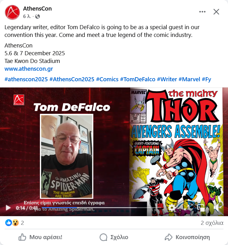 Gwynplaine Posted August 22 Member ID: 32,699 Group: Members Topic Count: 4 Content Count: 477 Reputation: 2,462 Achievement Points: 495 Days Won: 12 With Us For: 2,808 Days Status: Offline Last Seen: 1 hour ago Age: 42 Posted August 22 1 hour ago, Ubergorn said: Από το facebook του φεστιβάλ έχουμε τον δεύτερο καλεσμένο : Με μεγάλη μας χαρά υποδεχόμαστε τον θρυλικό καλλιτέχνη κόμικς Alex Saviuk! Με καριέρα που ξεπερνά τις τέσσερις δεκαετίες, ο Alex έχει δώσει ζωή σε μερικούς από τους μεγαλύτερους υπερήρωες όλων των εποχών. Ξεκίνησε στα τέλη της δεκαετίας του ’70 στη DC Comics με τίτλους όπως Green Lantern, The Flash και Superman Family, ενώ στη συνέχεια μετακινήθηκε στη Marvel, όπου καθιερώθηκε ως ένας από τους σημαντικότερους καλλιτέχνες του Spider-Man τις δεκαετίες του ’80 και ’90. Η περίφημη δουλειά του στο Web of Spider-Man και στο The Amazing Spider-Man τον έγραψε για πάντα στην ιστορία της Marvel. AthensCon 2025 5-6-7 Δεκεμβρίου Στάδιο Ταε Κβο Ντο www.athenscon.gr #AlexSaviuk #athenscon2025 #SpecialGuest #fy #Marvel #Comics #Artist https://www.facebook.com/share/v/17MgXN2Rbk/ Θα ξεθάψουμε τις κούτες με τα Καμπανάς 7 Quote