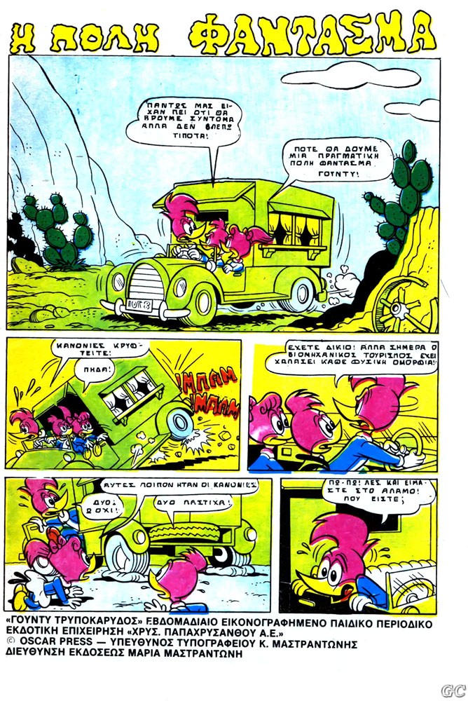 GreekComicFan Posted June 1, 2008 Member ID: 2,265 Group: Veterans Topic Count: 999 Content Count: 20,072 Reputation: 118,113 Achievement Points: 20,162 Days Won: 336 With Us For: 6,784 Days Status: Offline Last Seen: November 10, 2021 Age: 48 Posted June 1, 2008 Ένας από τους τίτλους που παρουσιάστηκε κάμποσες φορές από τον Παπαχρυσάνθου, με αποτέλεσμα να επικρατεί σύγχυση για τις περιόδους της κάθε σειράς, είναι και ο Γούντυ Ο Τρυποκάρυδος. Αυτή είναι η δεύτερη γνωστή σειρά με τον χαρακτήρα από τον εκδότη (η πρώτη είναι το 1979, αφιέρωμα εδώ). Εβδομαδιαία σειρά με 36 σελίδες, μισές έγχρωμες, μισές ασπρόμαυρες, με ασυνήθιστά καλή ποιότητα εκτύπωσης και χαρτιού, τόσο για την περιόδο που κυκλοφόρησε όσο και για τα δεδομένα του εκδότη. Πρέπει να ξεκίνησε με κόστος 15 δραχμών και να έγινε ανατίμηση στις 20 δραχμές γύρω στο έβδομο τεύχος. Δεν γνωρίζω πότε σταμάτησε (διαπιστωμένα 19), πρέπει να ήτανε όμως πριν την εμφάνιση της σειράς του 1984. 2 εσωτερικές σελίδες σαν δείγμα. Αργότερα κυκλοφόρησαν και τομάκια με 5 τεύχη το καθένα, χωρίς αριθμητική σειρά, με τα εξώφυλλα τους: Στην πρώτη εσωτερική σελίδα αναφέρεται πως την Διεύθυνση της Εκδόσεως την είχε η Μαρία Μαστραντώνη. Ευχαριστούμε για τα υπόλοιπα εξώφυλλα τους Dr Paingiver, Melandros, Valtasar, zoo, Retroplaymo και για τα εξώφυλλα των τόμων τους Σκύλος & DJO. 10 Quote